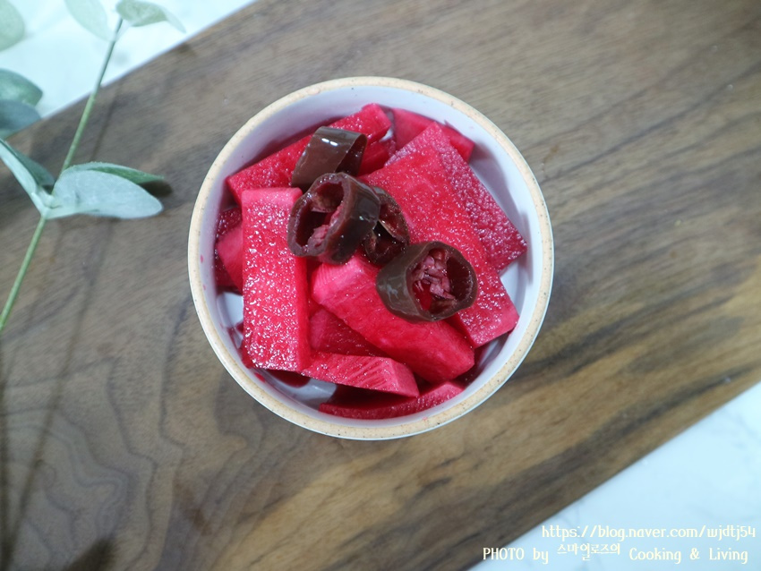まず、材料を準備します。ビーツは皮をむき、2〜3cm角の一口大に切ってください。大根も同様の大きさに切り、形を揃えます。韓国唐辛子はヘタを取り、1cm厚さの斜め切りにします。このように野菜をカットすると、ピクルスの見た目がより美しくなります。