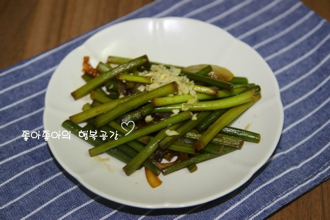 最後に、香ばしい風味を加えるために、ごま油を少量たらします。全体をもう一度軽く混ぜ合わせれば、美味しいにんにくの芽の醤油炒めの完成です!温かいご飯の上にのせて食べると、本当に美味しいですよ。