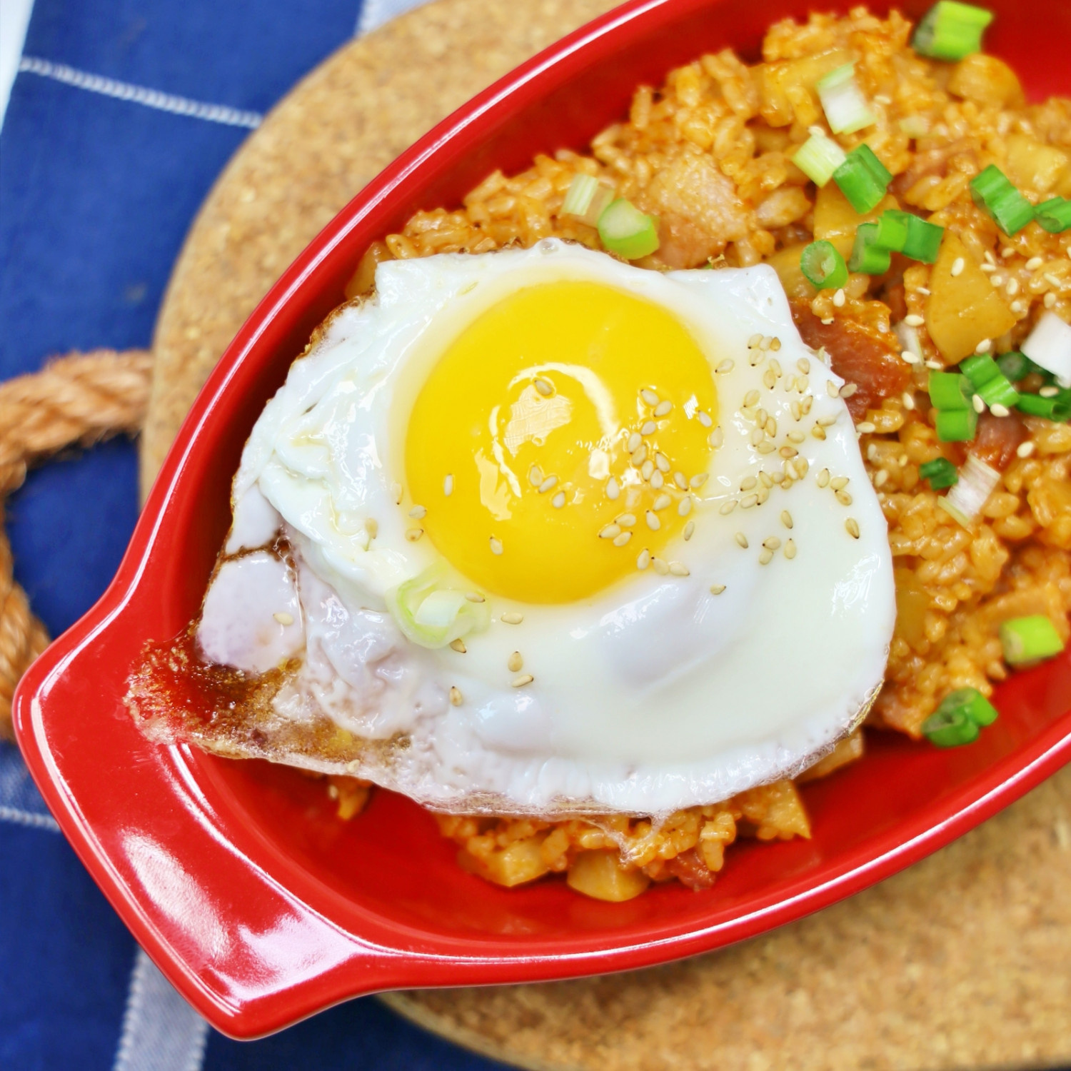 5. 目玉焼きと盛り付け:別のフライパンにサラダ油(大さじ1)を熱し、半熟または固焼きのお好みの目玉焼きを作ります。出来上がったカクテキチャーハンをお皿にきれいに盛り付け、その上に温かい目玉焼きを乗せます。最後に、刻んだネギと白ごまを散らせば、シャキシャキとした食感と甘辛い味が絶妙なカクテキチャーハンの完成です。手軽な夕食メニューとして最適でしょう?