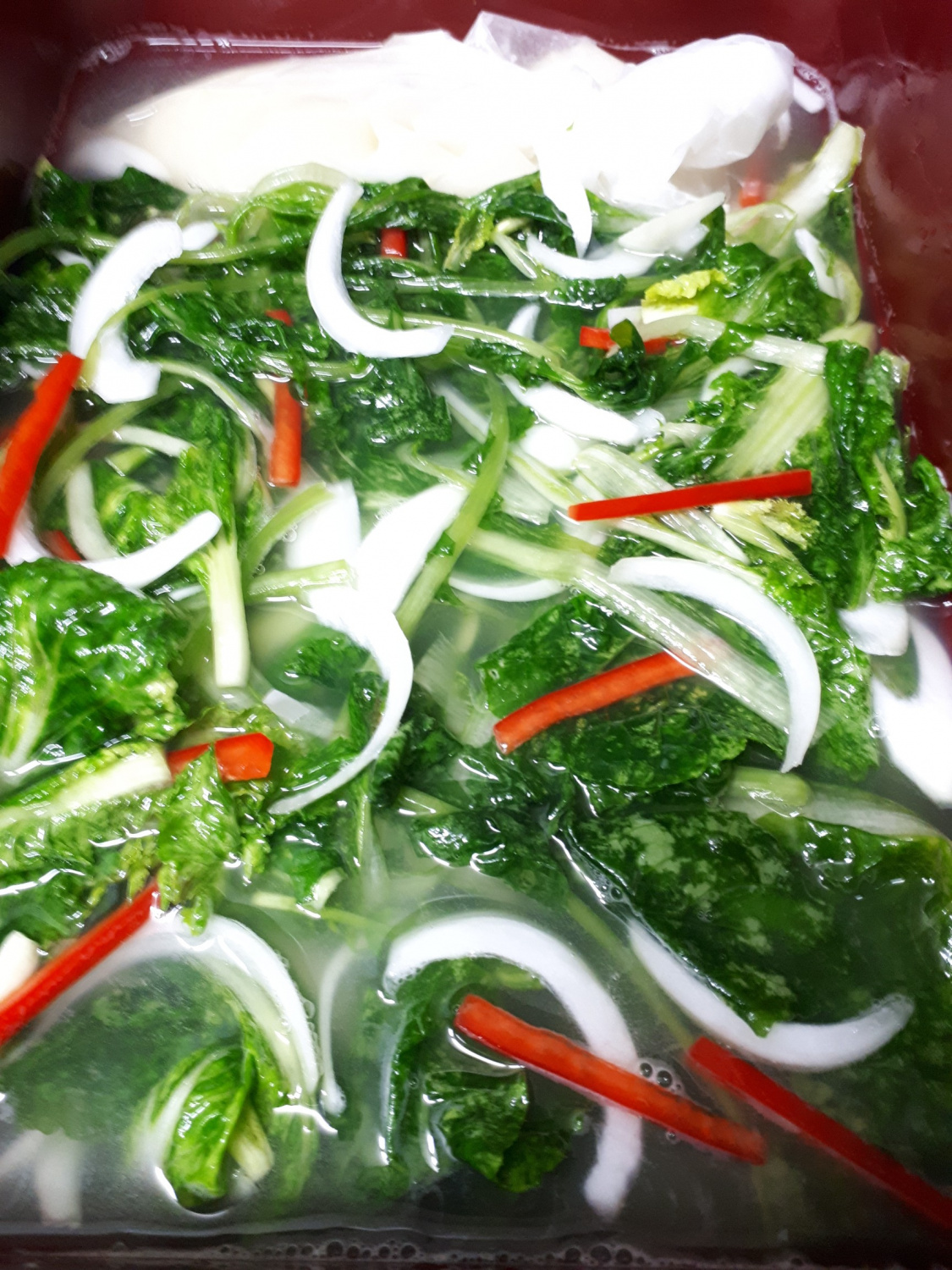 新鮮な春菊(ヨルム)とカブ(ソルギ)をきれいに下準備してください。オーガニック農園からいただいた大切な材料です!春菊の根元も使えますが、今回はきれいに切り落として使用しました。