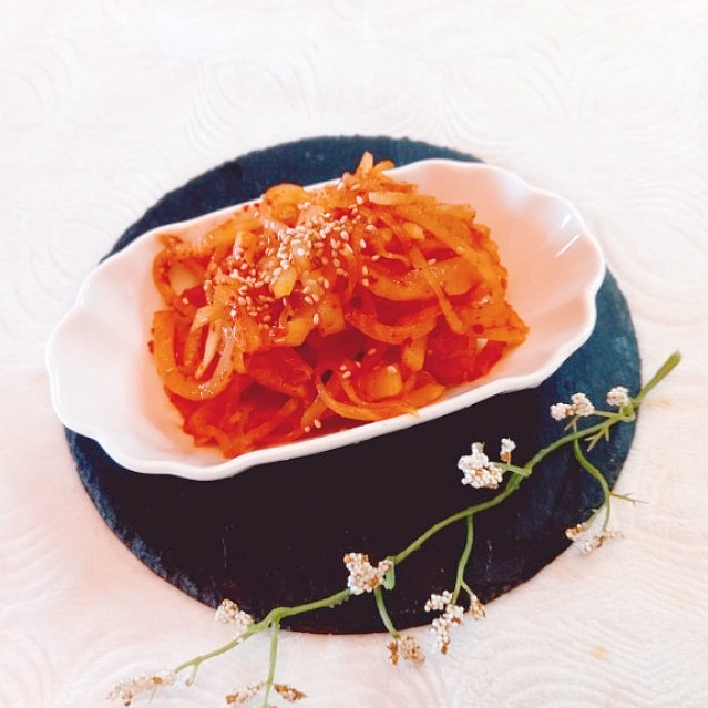 これで美味しいドンチムの和え物の完成です!ご飯のおかずとしてはもちろん、お子さんのお弁当の副菜としてもとても素晴らしい一品になります。シャキシャキした食感と甘酸っぱい味で、食欲をそそること間違いなしです。