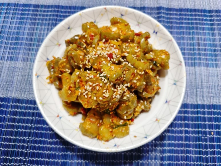 色鮮やかで食欲をそそるオイキムチムチムが完成しました!シャキシャキとした食感と旨味がたまらないオイキムチムチムで、楽しい食卓をお過ごしください。