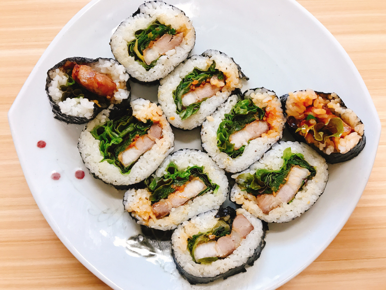 鮮やかな緑色の野菜と、食欲をそそる豚バラ肉の組み合わせが本当に美しいですね!私が作ったキンパはご飯がたっぷり入っているので、4本食べればお腹いっぱいになりそうです。*^^*