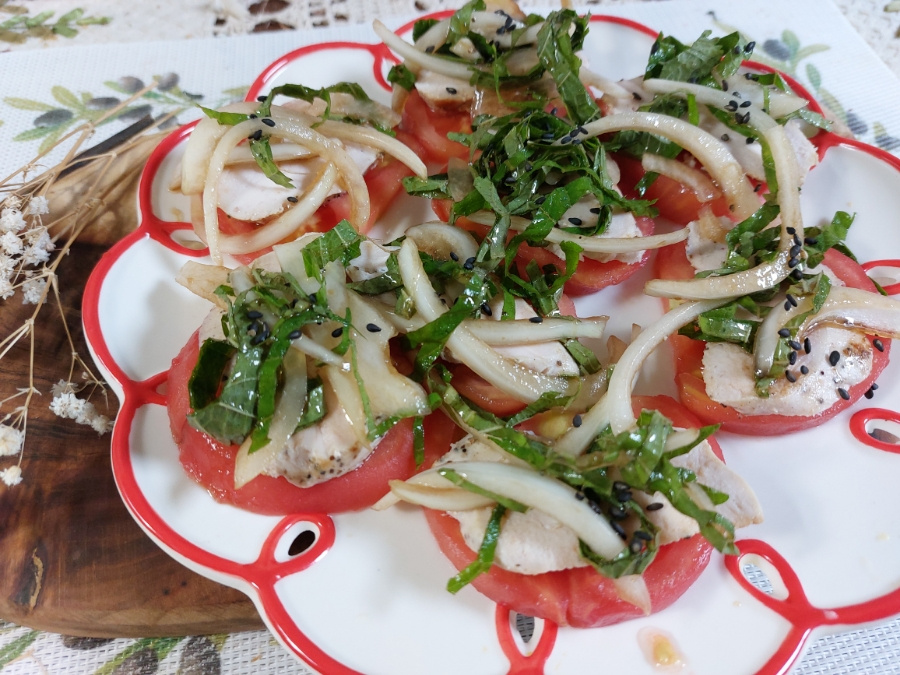ジューシーな完熟トマトとスモークチキンのマリネサラダ
