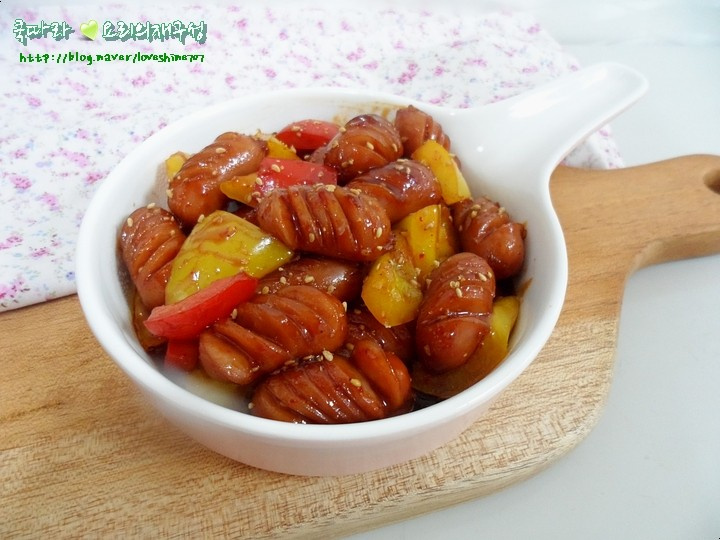 ここで、調味料(醤油大さじ1、オイスターソース大さじ1、ケチャップ大さじ1.5、きび砂糖小さじ0.5、コチュカル小さじ0.5)をすべて加えます。調味料がソーセージによく絡むように、中火で2~3分ほど炒め合わせます。焦げ付かないように注意してください。