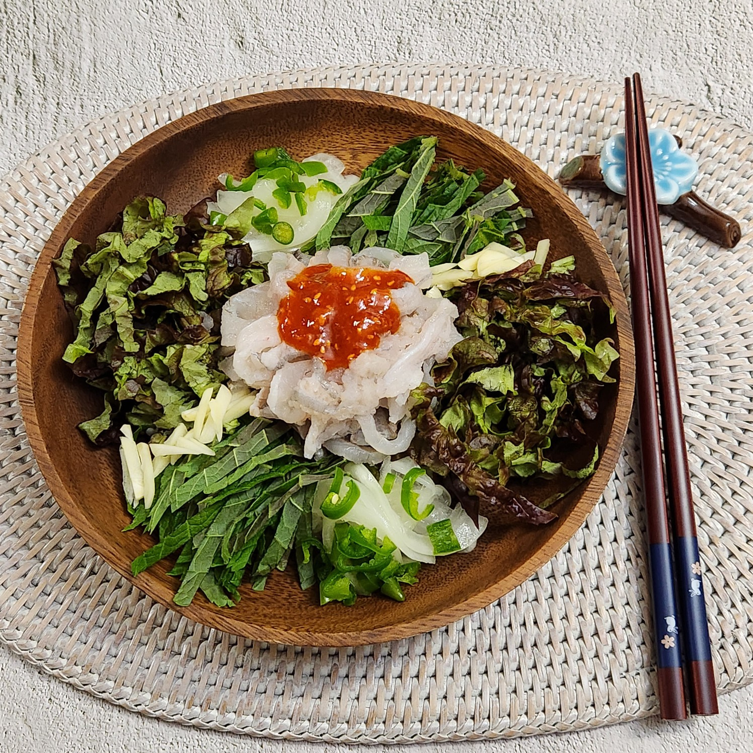 ご飯の上に、準備しておいたレタス、エゴマの葉、スライスしたニンニク、甘酢玉ねぎ、みじん切りにした青唐辛子を彩りよく散らします。中央には新鮮なドダリのセッコシ刺身を乗せ、その上から特製タレをたっぷりと回しかけます。あとは全体をよく混ぜて召し上がれ。食欲をそそる、甘酸っぱくてピリ辛なセッコシ刺身丼の完成です!どうぞ美味しくお召し上がりください。