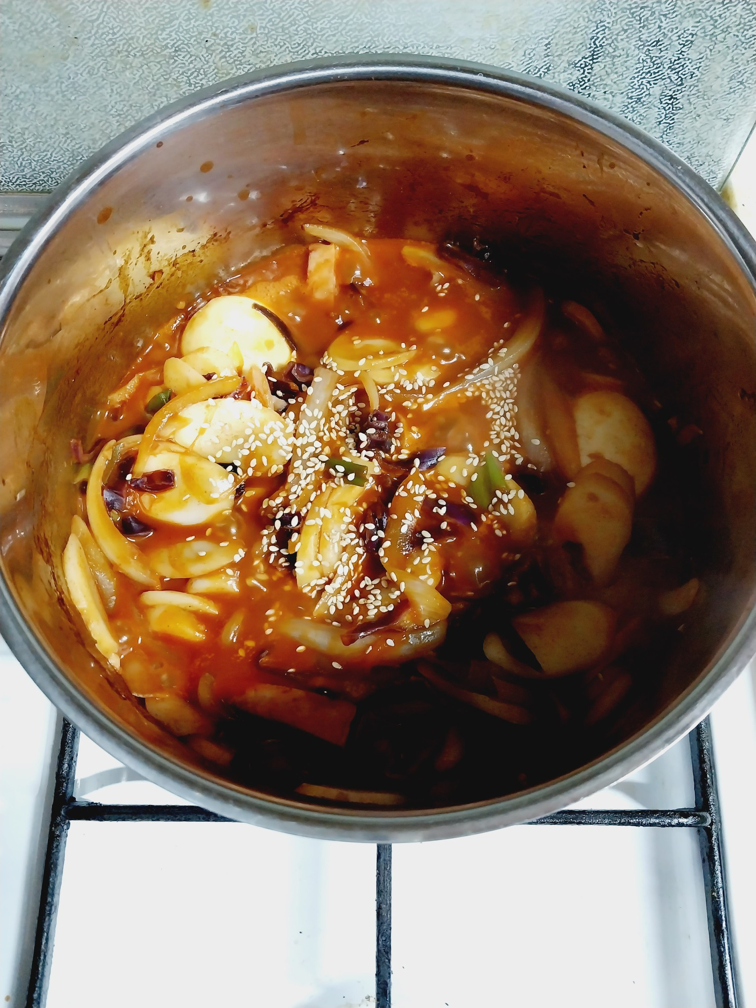 お餅に火が通ったら、用意しておいたゆで卵を加えて、ソースが全体に絡むように優しく混ぜ合わせます。火を止めて、仕上げにごま油大さじ1と白ごま大さじ1を振りかけて香ばしさをプラス。お皿に美しく盛り付ければ、美味しいトックク餅のトッポッキの完成です!