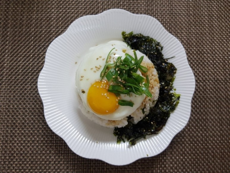 その上に、先ほど丁寧に焼いた半熟の目玉焼きをそっと乗せます。熱いご飯と溶けるバターの熱で、卵白は優しく火が通り、バターは溶けながら黄身と混ざり合い、ご飯に染み込んで絶妙なハーモニーを生み出します。
