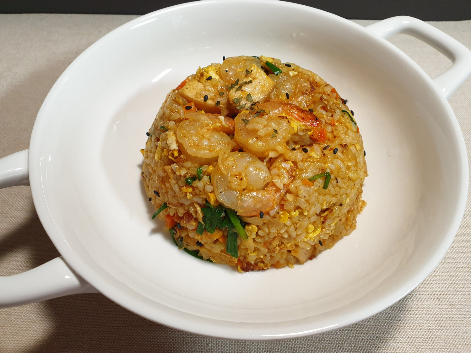 お皿に美味しそうに盛り付け、白ごまをたっぷり振りかけたら、香ばしさ倍増の、シンプルながらも奥深い味わいのエビと鶏むね肉のチャーハンが完成です!一口食べれば、満足感と幸せを感じること間違いなしです。