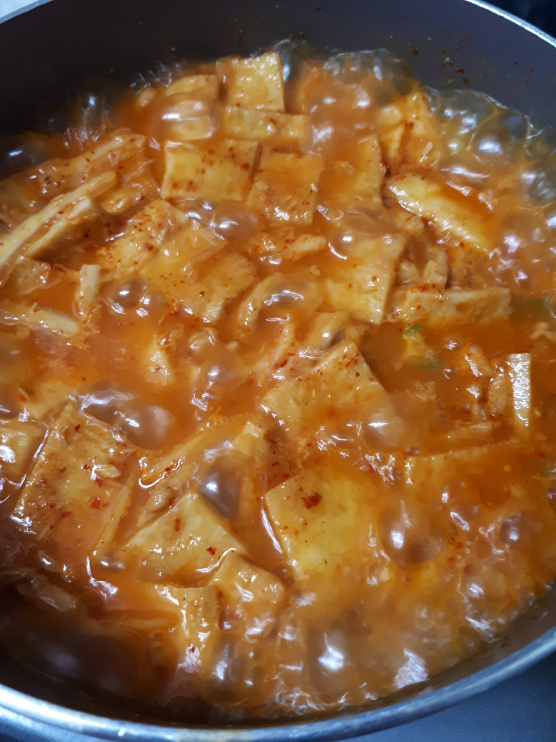 見た目にも食欲をそそる、おでんとツナのキムチチゲが完成しました!ご飯が止まらなくなるこのチゲは、簡単なのに味は本当に最高です。もちもちのおでんと風味豊かなツナが、キムチの深い味わいと合わさり、家族みんなが喜ぶ満足感のある一食になるでしょう。