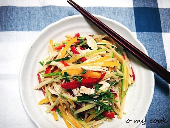 雨が一日中降り続いて蒸し暑い日が続きますね。中学生の娘が期末テストの真っ最中なのですが、お天気まで悪くてとても大変そうです。そんな暑い日に、娘の食欲を刺激して元気づけようと思って作りました。淡白で脂っこくない鶏むね肉に、さっぱりとした野菜を添えて、ピリッとしたからしソースで和えてみてください。ツンとくるからしソースがお口の中をさっぱりとさせてくれますよ〜^^。特別な日のごちそうにも、おもてなし料理にもぴったりです。