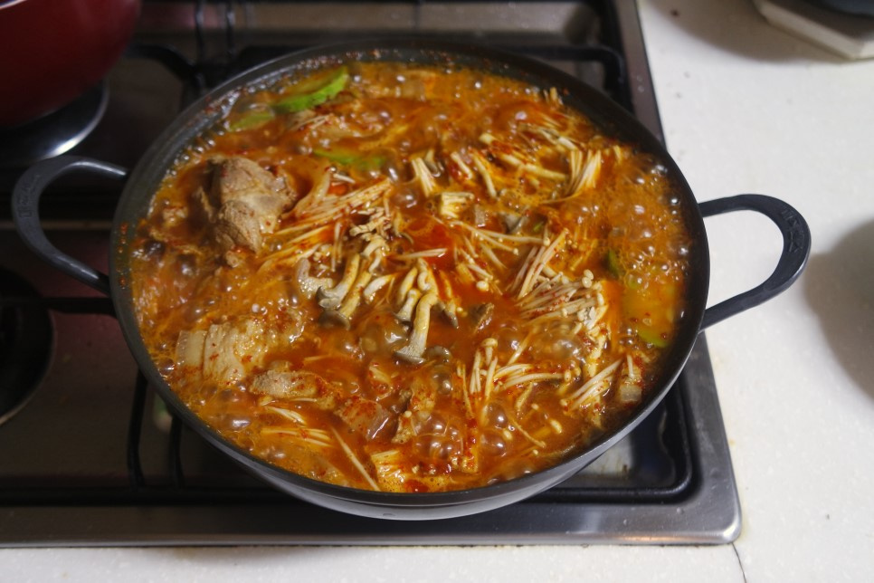 玉ねぎと青唐辛子が程よく煮えてスープの味が馴染んできたら、準備しておいたエリンギとヒラタケを加えます。きのこがしんなりするまで、さっと煮れば美味しい豚肉チゲ(チャグリ)の完成です!きのこを煮すぎると食感が悪くなるので注意してください。どうぞ召し上がれ!