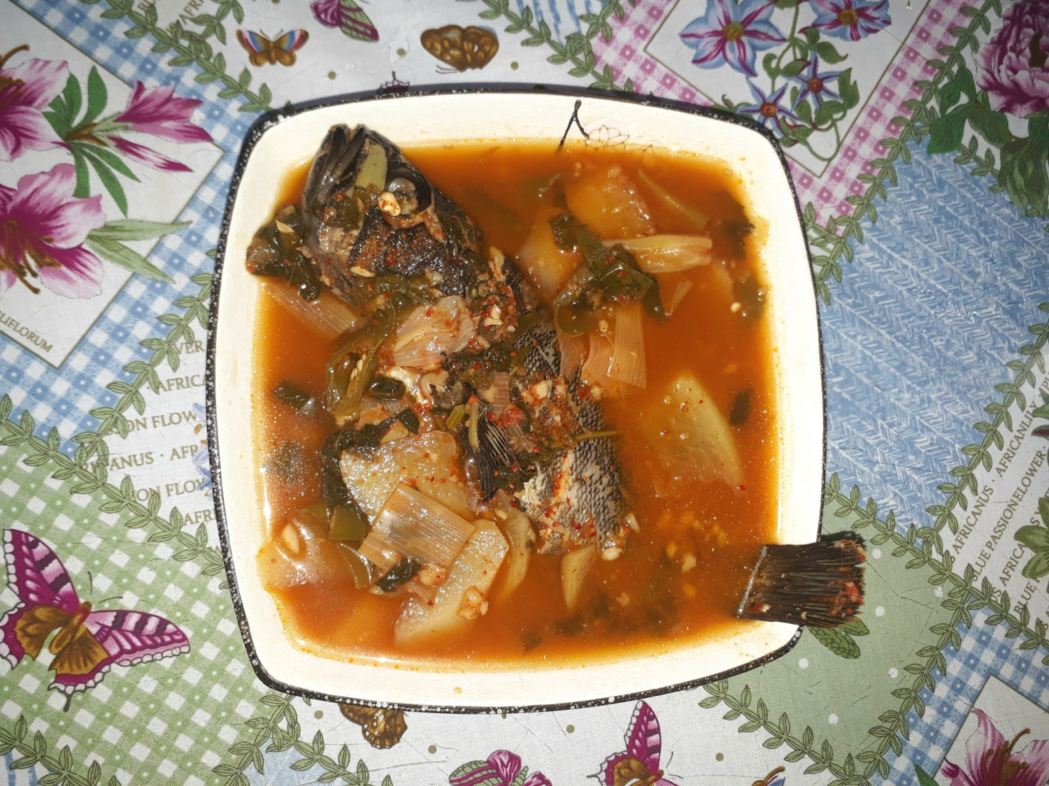 ロックフィッシュに火が通ったら、最後に大きめに切った長ネギ、香りの良いハッカク(バングィプ)、そしてお好みでサンショウの実(ゼピカル)と黒こしょう小さじ1を加えます。ひと煮立ちしたら火を止めます。ハッカク(バングィプ)の香りがスープに移るのがポイントです。最後に味見をして、もし薄ければ塩で味を調えれば、美味しいロックフィッシュチゲの完成です!