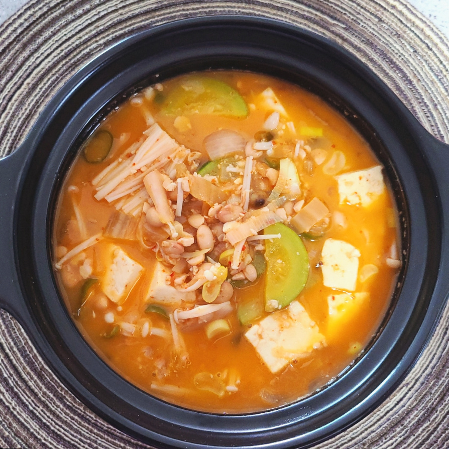 5分後、火を少し弱めて、準備しておいたズッキーニ、韓国産唐辛子、エノキダケ、玉ねぎ、豆腐をすべて加えます。全体が均一になるように、優しくかき混ぜてください。