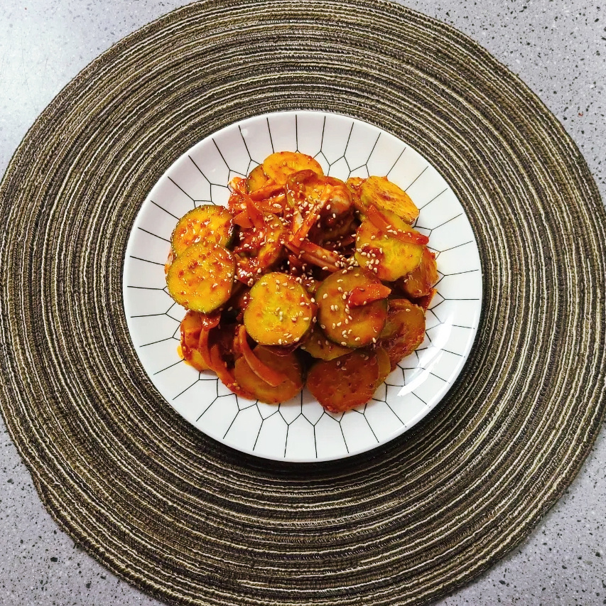最後に、出来上がったきゅうりの和え物の上に、ごまをたっぷり振りかけると、香ばしい風味が加わり、さらに美味しくいただけます。これで、パリパリで美味しいコチュジャンきゅうりの和え物レシピの完成です!炊きたてのご飯と一緒に美味しく召し上がってください。