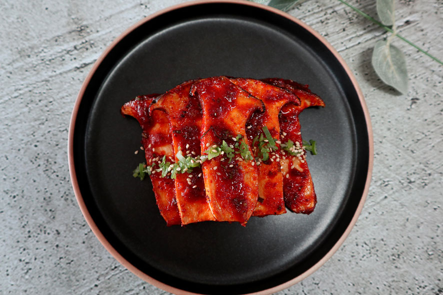 鮮やかな赤色とエリンギの茶色が食卓を彩り、お祝いの席にもぴったりな一品になります。ピリ辛甘口でとろける食感のエリンギのコチュジャン焼き、ぜひご堪能ください!:)