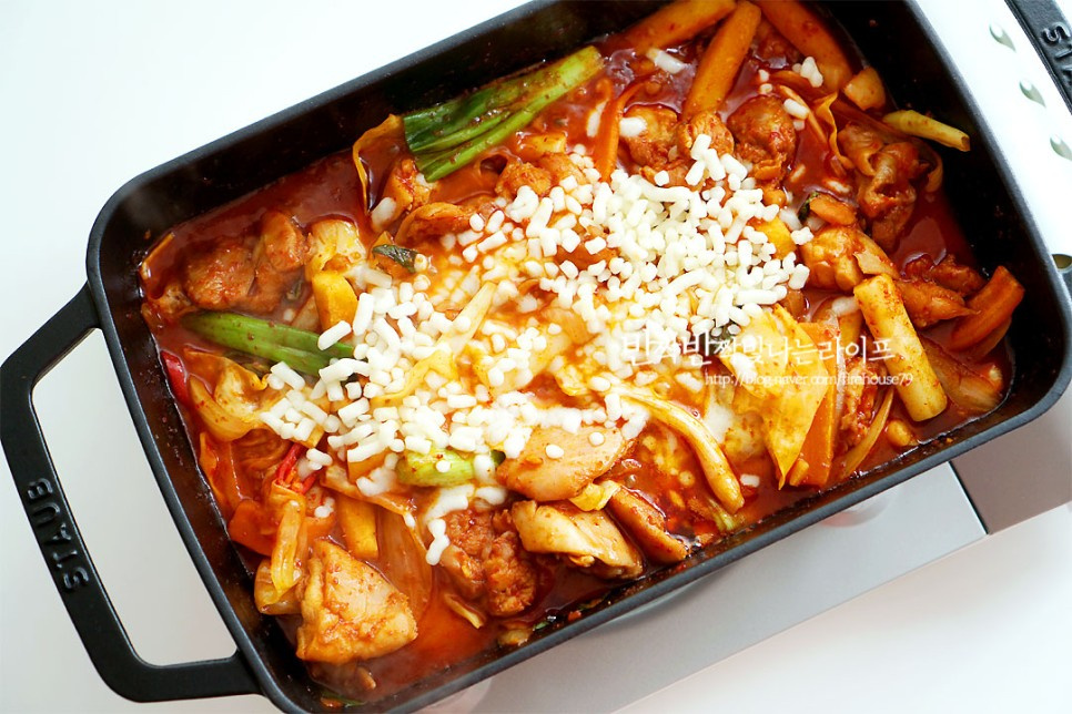 チーズを乗せて仕上げ:完成したタッカルビを、食卓のコンロやポータブルバーナーに移して温めながら食べると、さらに美味しくいただけます。タッカルビの上にモッツァレラチーズをたっぷり散らし、蓋をするか弱火でチーズが溶けるまで待ちます。チーズがとろ〜りと伸びたら、召し上がる準備は完了です!