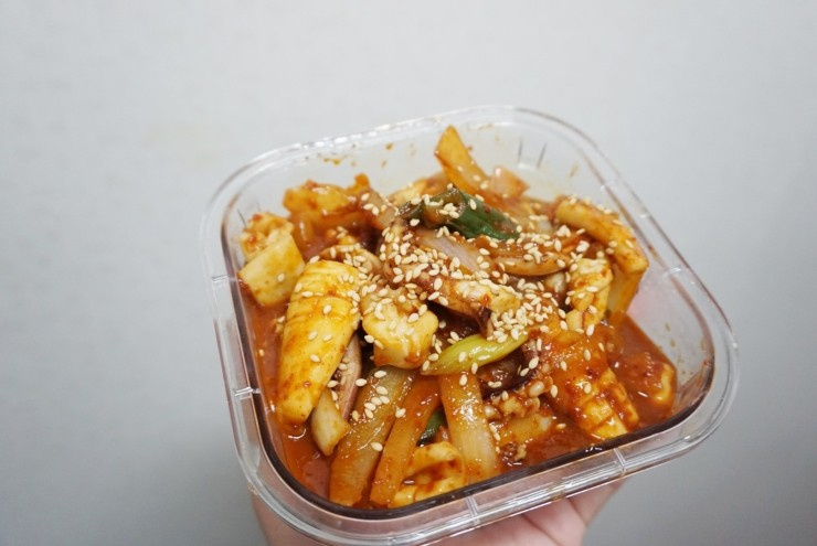 すべての材料と調味料がよく絡み合うように煮詰めていきます。中火で、イカが完全に火が通り、調味料が程よく煮詰まるまで炒めてください。玉ねぎが透明になったら火を止め、出来上がったイカの炒め物を保存容器に移します。
