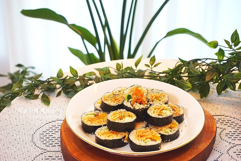 巻き終わったキンパの表面には、香ばしさをプラスするためにごま油を軽く塗り、白ごまをパラパラと振りかけます。その後、清潔な包丁で食べやすい大きさに切り分ければ、美味しいピリ辛おでんキンパの完成です!キンパの具材は硬くないので、キンパが崩れずにきれいに、そして上手に切れるのが利点です。
