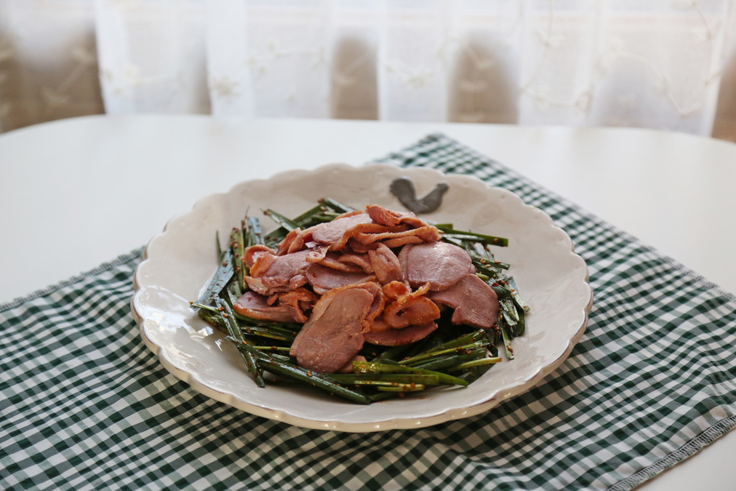 お皿に、先ほど和えたばかりのみずみずしいニラのおひたしを彩りよく盛り付けます。その上に、温めたスモークダックをたっぷりとのせれば、豪華な一皿の完成です!さあ、美味しい食事を楽しみましょう。