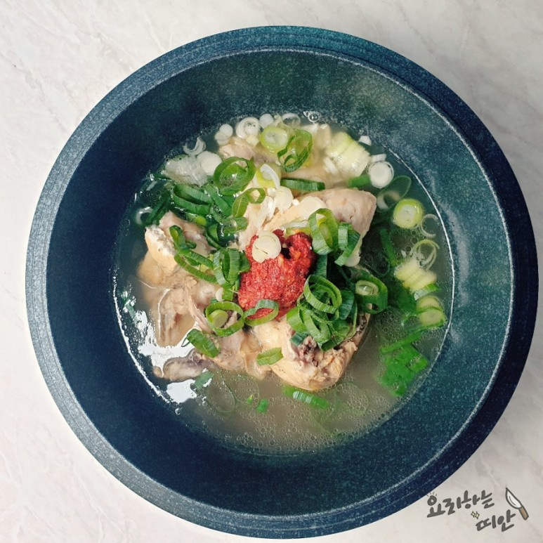 最後に、先ほど刻んでおいた長ネギをたっぷりと散らせば、ピリ辛で美味しい赤い参鶏湯の完成です!温かいスープと柔らかい鶏肉を一緒に味わってください。