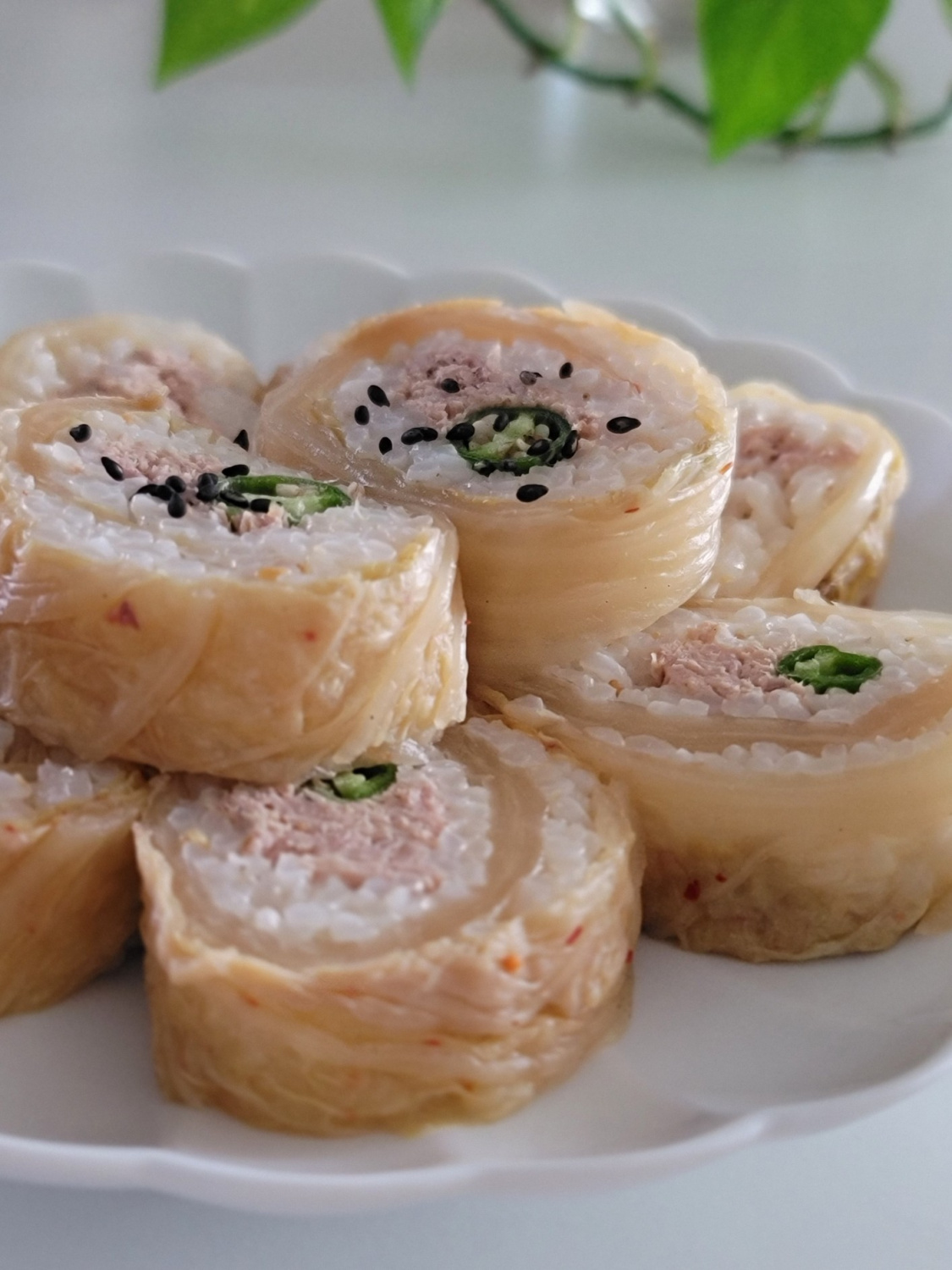 食欲をそそる辛さ! 청양고추とパリパリ白菜キムチの相性抜群!ツナマヨ白菜キムチ巻き