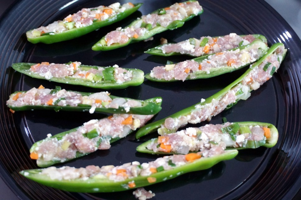 切り開いた唐辛子は、流水で丁寧に洗い、水気をよく拭き取って準備しておきます。こうすることで、種を詰めやすくなります。