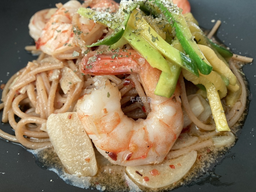 フライパンが十分に温まったら、海老を熱々のオイルで手早く絡め炒めます。こうすることで、海老の旨味が閉じ込められます。すぐに、茹でたパスタもフライパンに加え、全体を混ぜ合わせながら炒めてください。