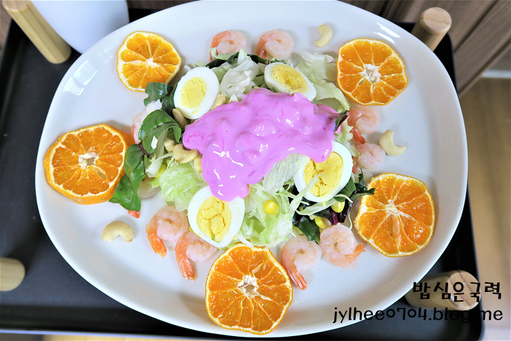 こんにちは!「밥심은 국력(パプシムン グンリョク)」です。今日は、新鮮なサラダをさらに豊かで美味しく楽しめる「シュリンプサラダ」のレシピをご紹介します。まず、レシピに使用する「ボイル済みカクテルシュリンプ」についてご説明しましょう。「ボイル済み(자숙)」とは、一度加熱調理済みであるという意味です。「カクテル」は、エビの尻尾の形がカクテルグラスの飾り(ガーニッシュ)のように見えることから名付けられました。つまり、ボイル済みカクテルシュリンプとは、殻をむき、背わたを取り除いた後、尻尾の部分だけを残した状態で一度加熱し、冷凍されたエビのことです。そのため、下処理の手間がかからず、調理時間を大幅に短縮できるので、とても便利なんです。 さあ、この美味しいカクテルシュリンプを使って、食欲をそそる爽やかなシュリンプサラダを一緒に作りましょう。新鮮な野菜とプリプリのエビの組み合わせは格別で、ブランチにも、軽い食事にもぴったりです。ぜひご家庭で手軽に作ってみてください!