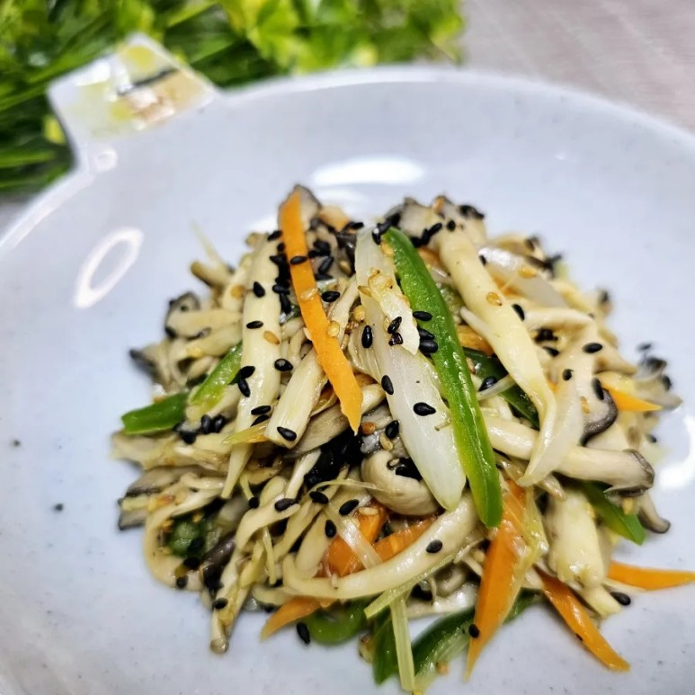 最後に、炒りごま大さじ1/2を全体に振りかけて仕上げます。ごまの香ばしさと食感が加わり、より一層美味しいエノキ茸の炒め物の完成です。