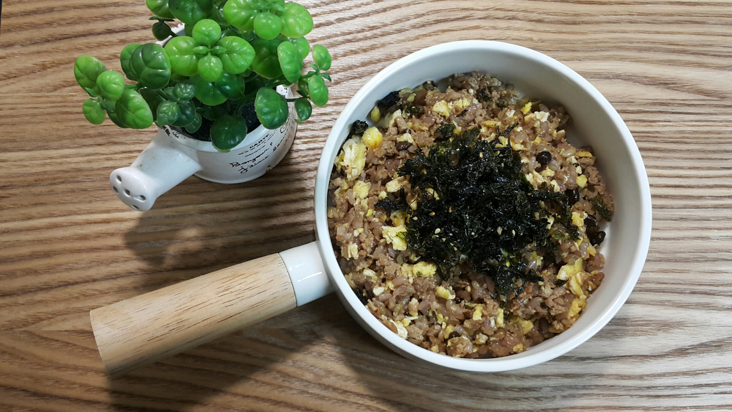 最後に、エゴマ油(またはごま油)大さじ1をフライパンの縁から回し入れ、全ての材料と手早く混ぜ合わせるように炒めます。エゴマ油(またはごま油)の香ばしい香りが加わったら火を止め、お好みで刻み海苔を散らしましょう。酸味のある白菜キムチを添えて食べると、くどさがなくなり、さらに美味しくいただけます。本当に簡単なのに美味しいプルコギチャーハンの完成です!