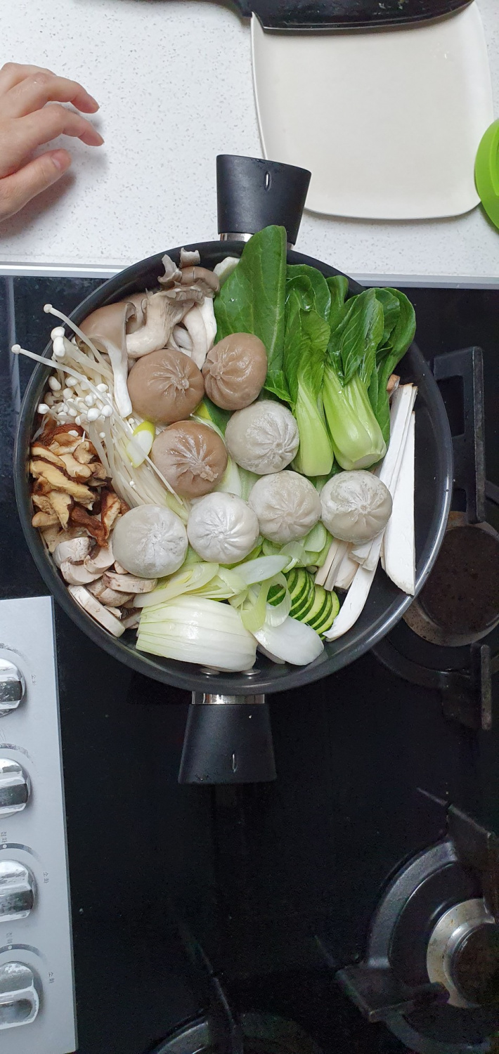 「しめじ」や「えのき茸」は食べやすい大きさに切ります。えのき茸は石づきを取り、ほぐしておきましょう。準備したきのこ、チンゲン菜、ズッキーニ、玉ねぎ、長ねぎを鍋に彩りよく盛り付けます。もしだし汁がなければ、鍋の底にだし用の煮干しを敷いてください。シャキシャキした食感を加えたい場合は、もやしをたっぷり加えても美味しいです。(だし汁が自宅にある場合は、それを使うとさらに手軽です。)