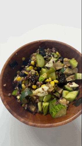 こうしてできた特製ビビンバソースを、準備したきゅうりビビンバ全体に均等にかけます。お好みで半熟の目玉焼きを乗せれば、健康的で美味しいきゅうりビビンバの完成です!どうぞ召し上がれ~