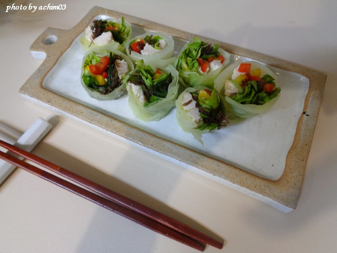 まず、野菜を準備しましょう。ししとう(またはピーマン)は縦半分に切り、種を取り除いて細切りにします。黄パプリカと赤パプリカも同様に、種を取り除いて細切りにしてください。お好みの海藻類や手巻き用乾燥わかめ、そして冷蔵庫にあるレタス類を洗って準備しましょう。どんな野菜でも代用可能なので、気軽に用意してくださいね!