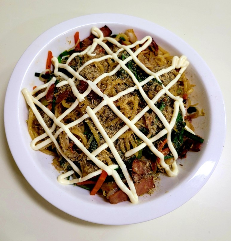 完成した焼きうどんを器にきれいに盛り付けます。その上に、あらかじめ作っておいた香ばしい燻製イワシの粉末をふりかけ、お好みでマヨネーズをかけると、見た目も味も素晴らしいベーコンと豆もやしの焼きうどんの完成です!どうぞ召し上がれ。