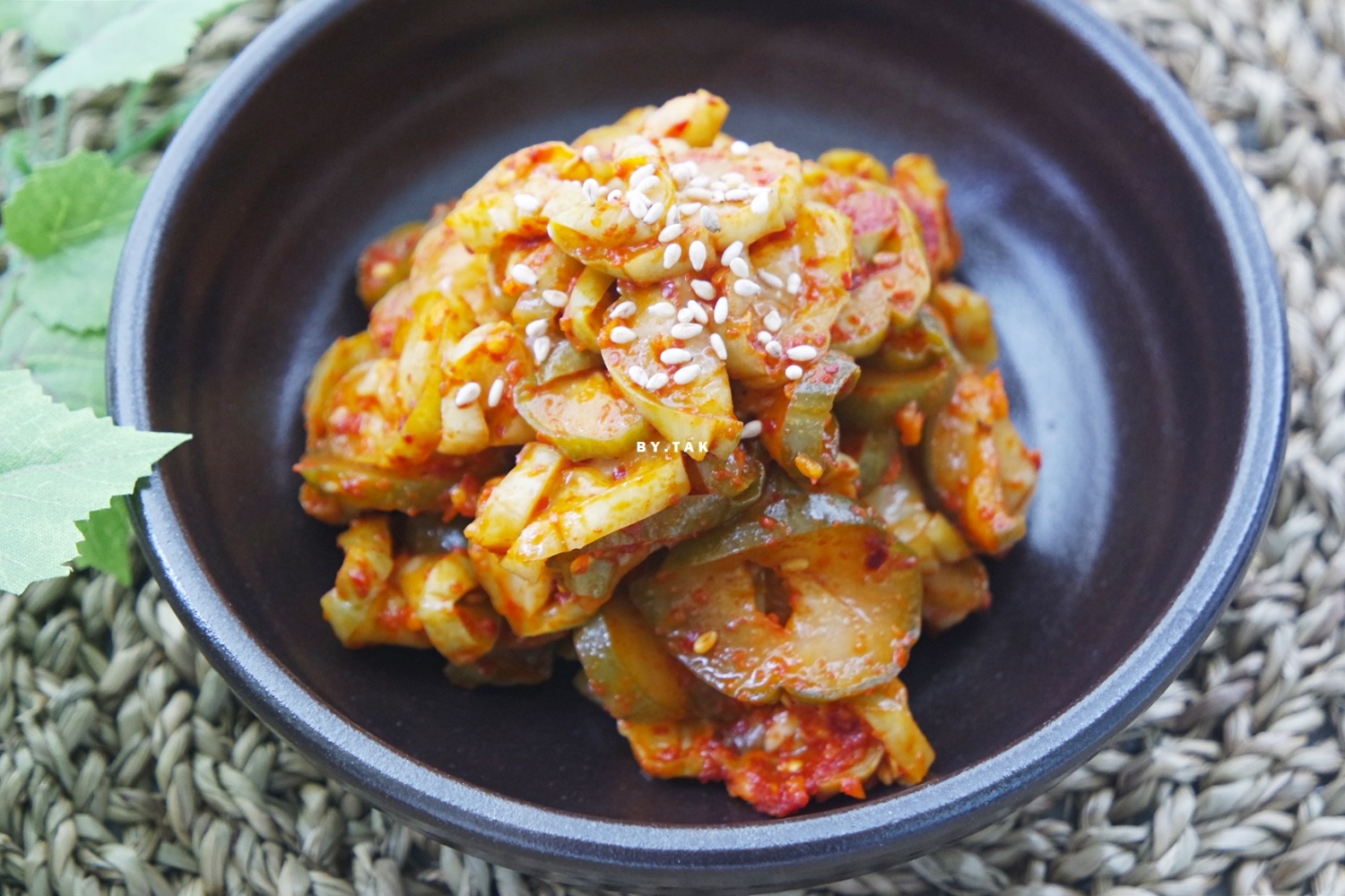 まず、オイキムチを流水で軽く洗い、きれいにします。次に、約5mm厚さの輪切りにします。塩分を和らげるために、切ったオイキムチをぬるま湯に約1時間浸しておきます。