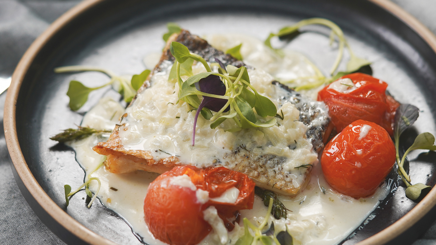 お皿に焼きあがったシーバス、アスパラガス、ミニトマトをきれいに盛り付けます。その上から、先ほど作った温かいレモンクリームソースをたっぷりとかけます。最後に、新鮮なベビーリーフを少し添えれば、見た目も華やかな「レモンディルバター焼き魚」の完成です!爽やかなレモンとディルの香り、そしてクリーミーなソースのハーモニーをお楽しみください!