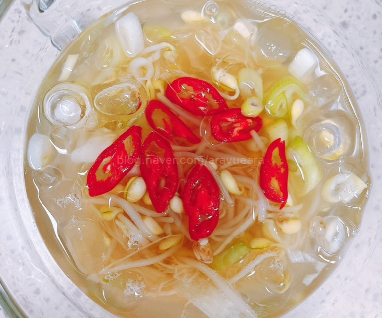 最後に、輪切りにした赤唐辛子を数枚散らせば、見た目も鮮やかなもやしの冷製スープの完成です!すぐに冷たいままお召し上がりください。