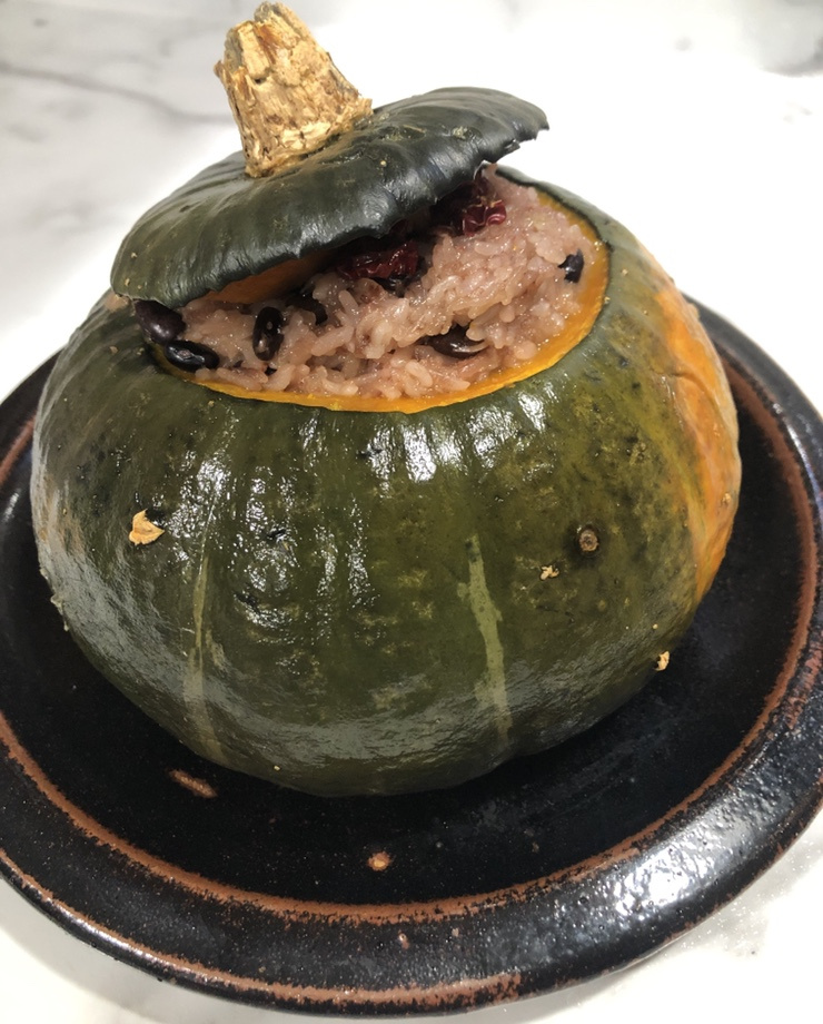 じゃーん!見た目も美味しそうなかぼちゃの栄養満点ご飯が完成しました。蓋を閉じたまま食卓に出すと、見た目も華やかで、心のこもった一品になりますよ。