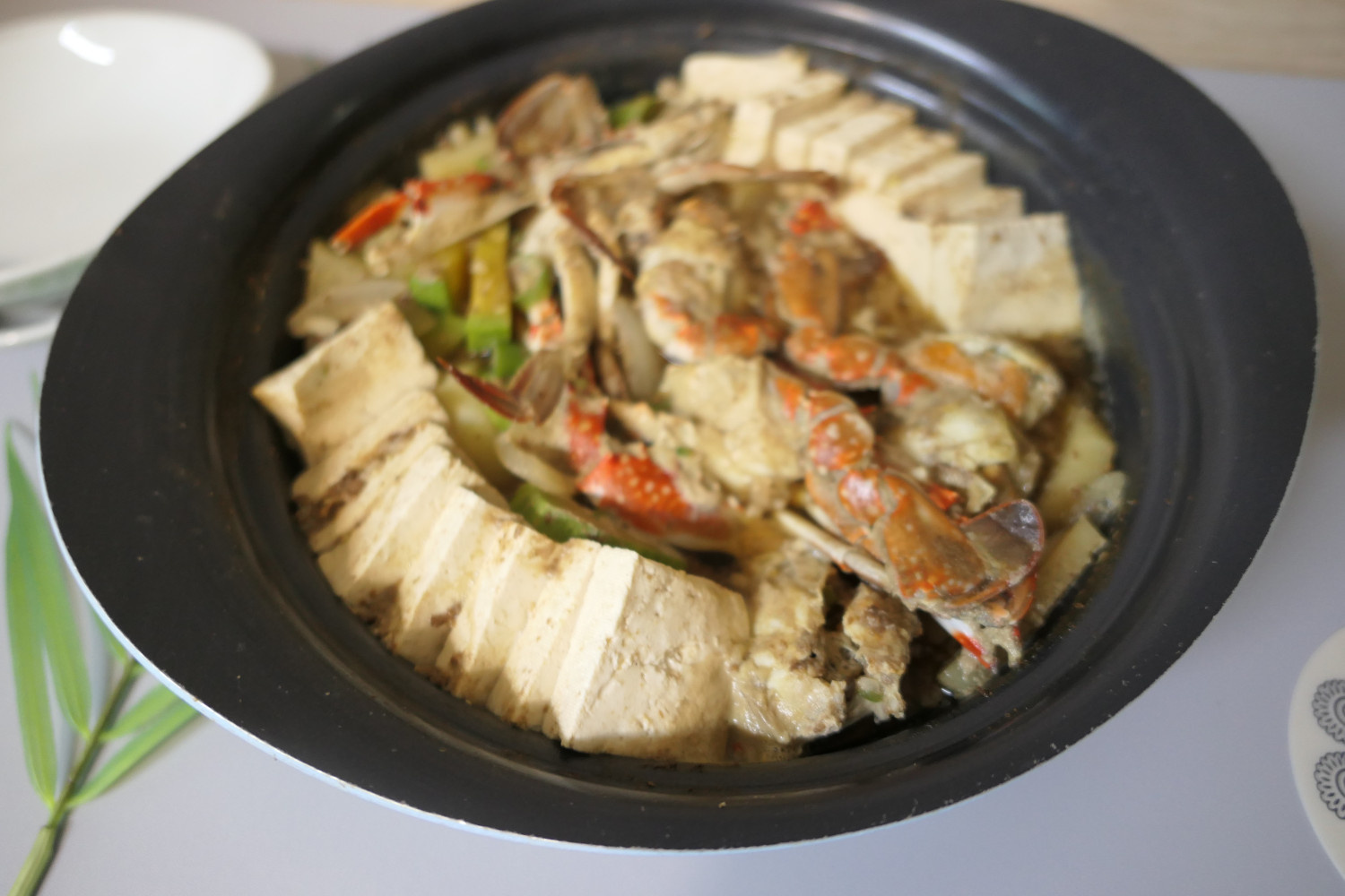 じゃがいもが半分くらい火が通り、少し歯ごたえが感じられるようになったら、次の材料を加えるタイミングです。半月形に切ったズッキーニと玉ねぎ、そして食べやすい大きさに下処理したワタリガニを鍋に入れます。最後に、豆腐は大きめに切って鍋の縁に沿って並べると、見た目も美しく、火の通りも均一になります。