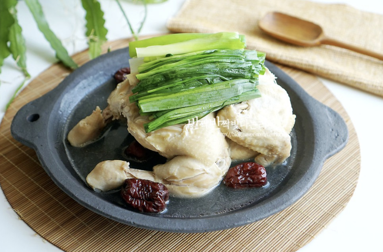 これで全ての準備が整いました!大きめの器に、食べやすく切った鶏肉をきれいに盛り付け、その上にさっと湯通ししたニラと長ねぎを彩りよく乗せます。温かい鶏だしをたっぷりとかければ、湯気が立ち上る美味しいタッペクスが完成です!お好みで、塩やこしょうをつけてお召し上がりください。:)