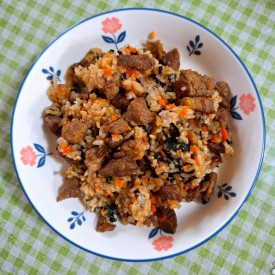牛肉が十分に火が通り、水分がほとんど飛んだら、温かいご飯1〜2膳分を加えます。ヘラでご飯を軽く押さえるようにしながら、牛肉とご飯が均一に混ざるように混ぜ合わせましょう。この段階では、一時的に火を消すと良いでしょう。ご飯粒が潰れず、パラパラに炒めるのを助けてくれます。ご飯粒一つ一つに牛肉の味が染み込むように、よく混ぜてください。