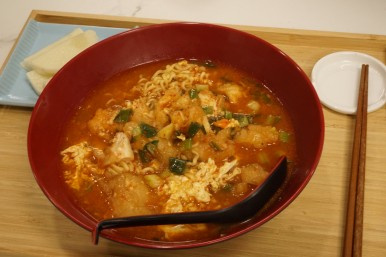 麺が程よく茹でられてほぐれてきたら、切っておいた酢豚または郭包肉をスープの上に乗せます。衣がスープを吸って、だんだんと柔らかくなってきます。