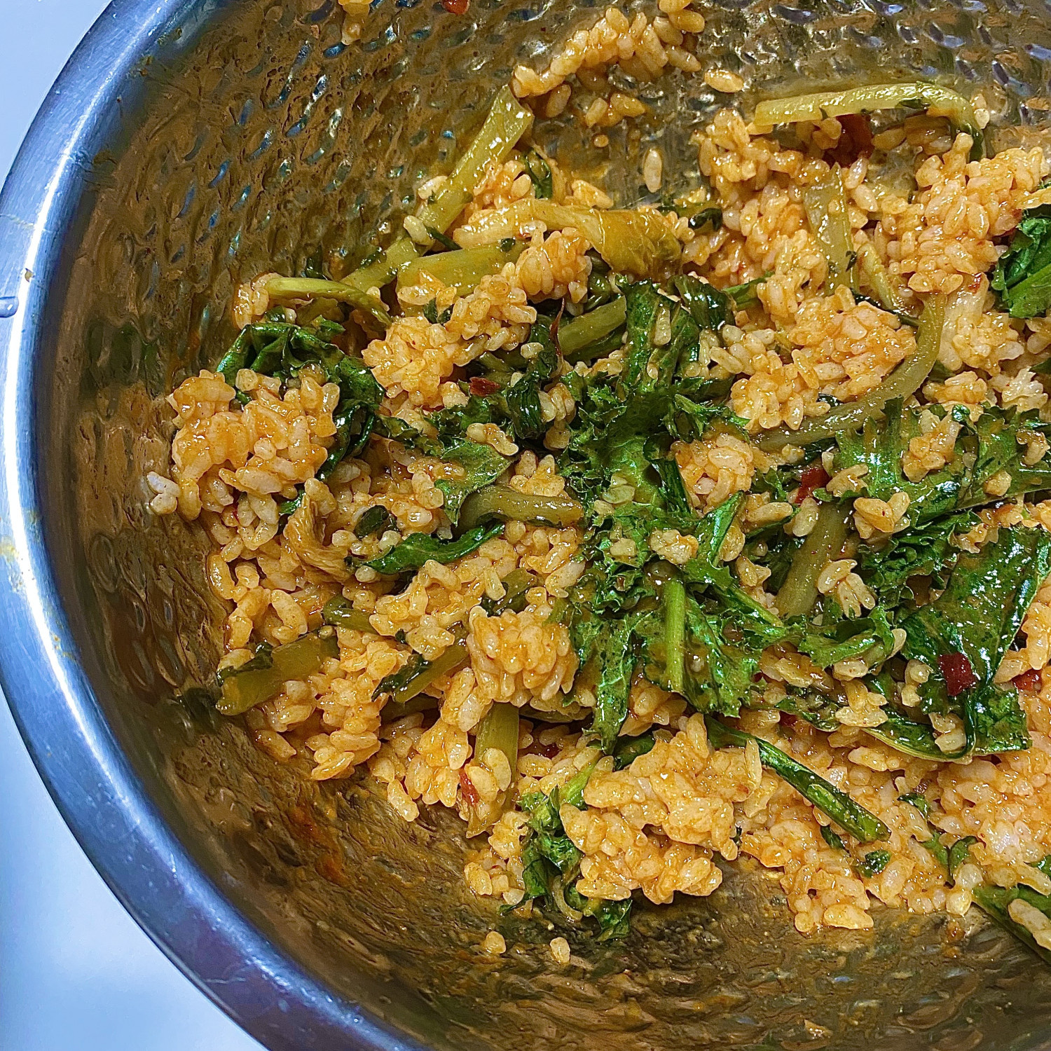 ヨルムキムチは、食べやすい大きさに刻みます。もしキムチの汁気が多い場合は、軽く絞ってください。次に、ご飯の上に刻んだヨルムキムチをたっぷりと乗せます。そして、コチュジャン、ニンニクのみじん切り、オリゴ糖、ごま油を混ぜ合わせたヤンニョムを回しかけましょう。最後に、炒りごまを振りかけると、彩りも豊かになります。