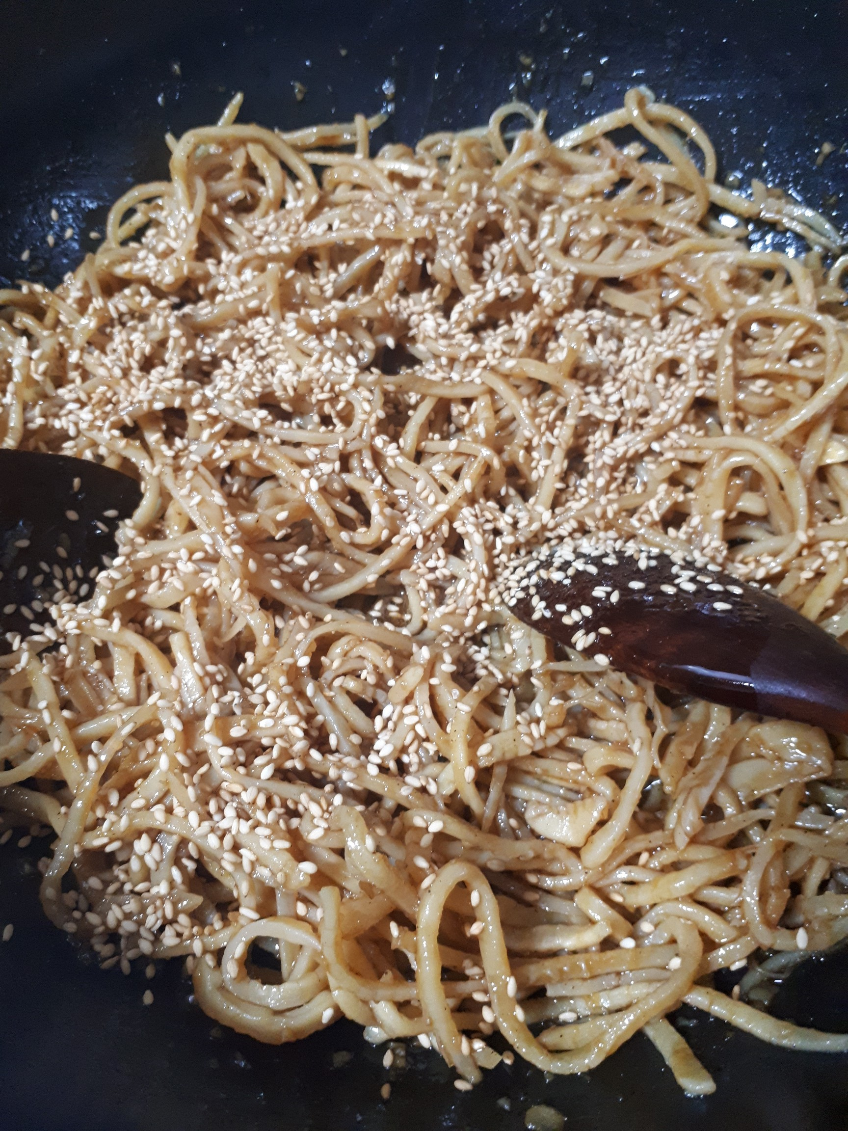 最後に、器に盛り付け、香ばしいごま油大さじ1と炒りごま少々を全体に振りかけたら、美味しいジンミチェの醤油炒めの完成です!温かいご飯の上にのせて食べると絶品ですよ。