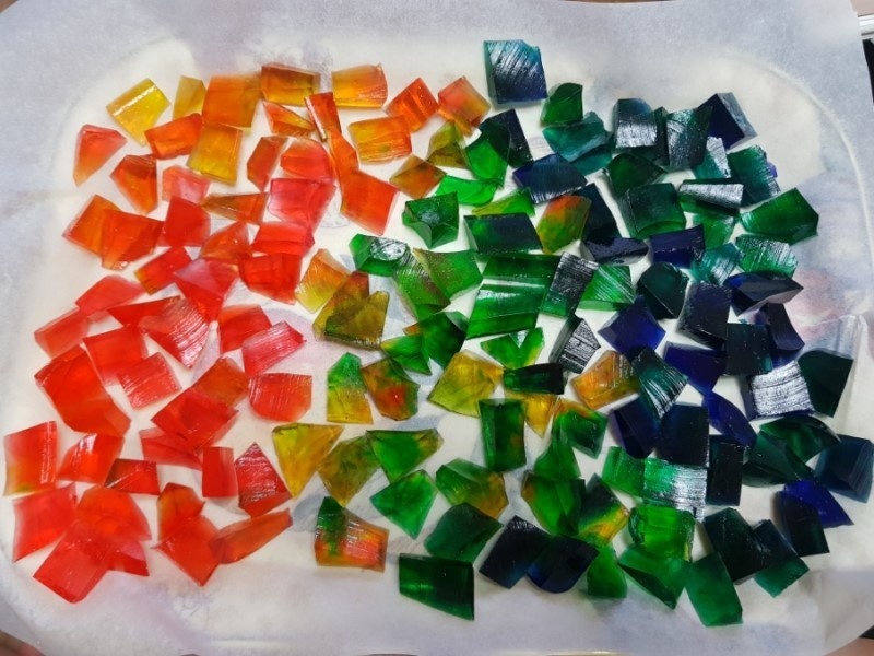 カットした琥珀糖の欠片を一つずつ手に取り、透明感や色合いを楽しみましょう。自然光や明るい照明の下で見ると、宝石のような輝きがさらに引き立ちます。(コツ:最初は薄い色で作ると、失敗しにくく、より宝石らしい仕上がりになります。)