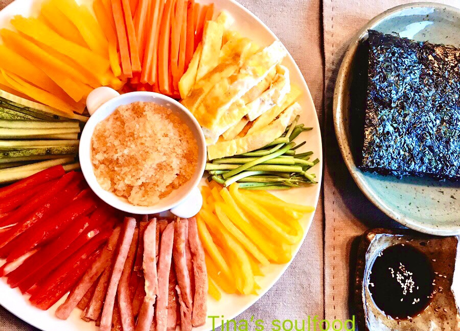 まず、キンパに使う野菜(赤パプリカ、黄パプリカ、にんじん)は細長く千切りにします。卵は溶いて薄焼き卵を作り、千切りにします。スパムもキンパの大きさに合わせて切り、こんがりと焼いて準備します。準備したキンパの具材は、それぞれお皿にきれいに盛り付けます。とびこは軽く水で洗い、ザルにあけて水気を切っておきます。