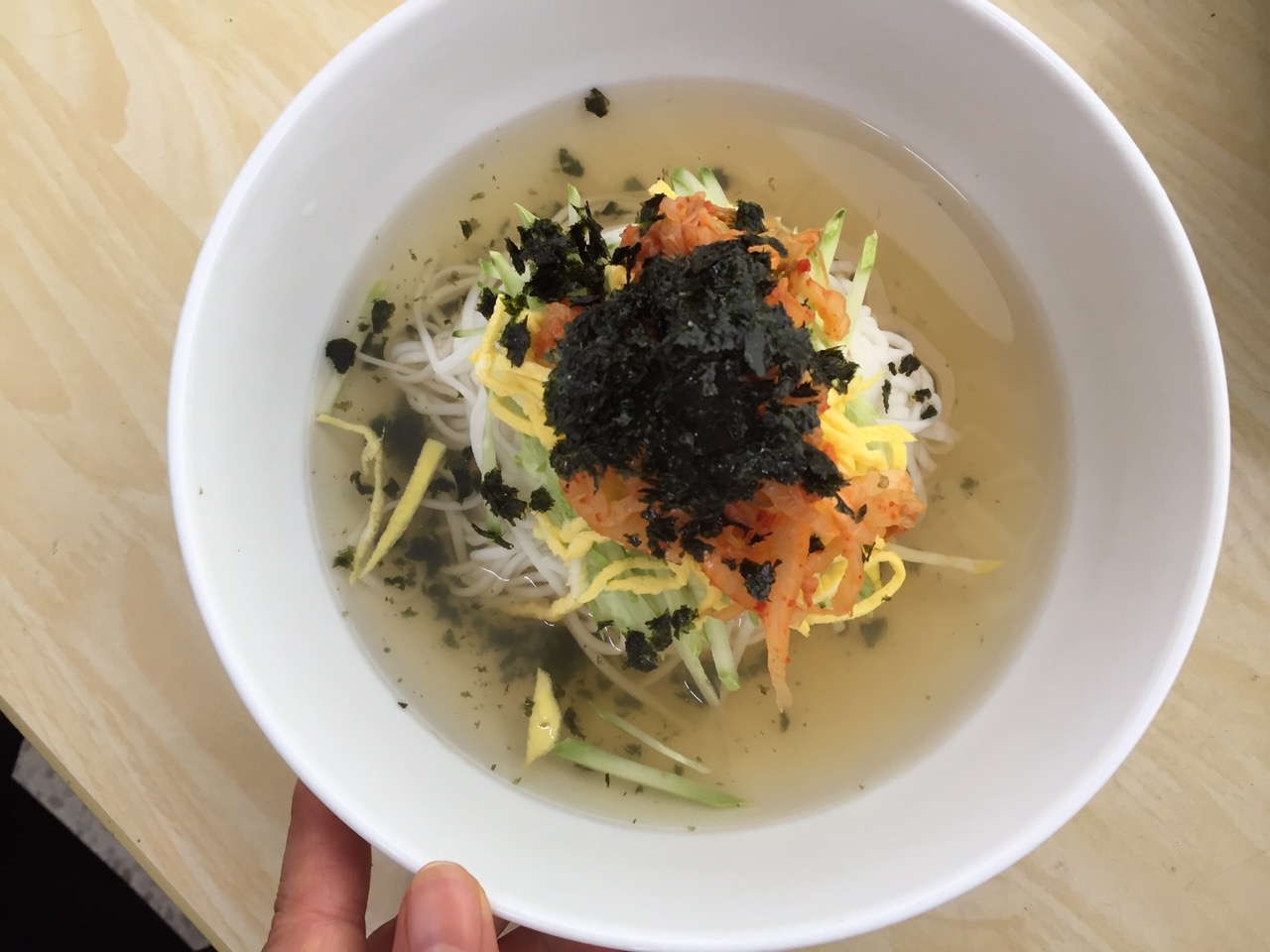 きゅうりはきれいに洗い、細切りにします。海苔はビニール袋に入れ、手で細かくちぎるか、ハサミで細かく切って海苔フレークを作ります。こうすると香ばしい海苔フレークがチャンチグクスに風味を添えます。