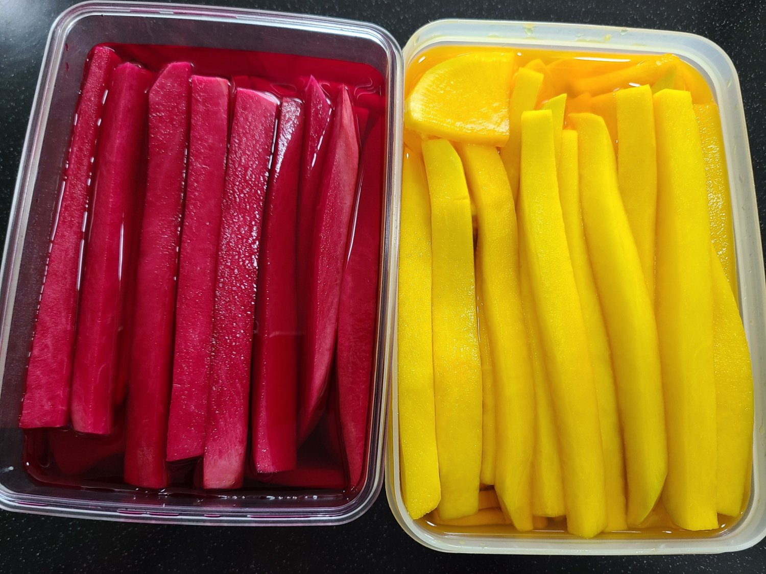 キムチの季節が終わり、済州島のたくあんがお手頃な価格で手に入るようになったので、チャンアチ(漬物)やキムチに加えて、自家製のたくあん(단무지)作りに挑戦してみました!このレシピでは、ビーツとクチナシの実という天然素材を使って、鮮やかで爽やかな酸味と満足のいく歯ごたえのたくあんを作ります。思ったより簡単なので、一緒に作ってみましょう!詳しいビデオチュートリアルもこちらでご覧いただけます:https://youtu.be/Dq7D2OWxJqQ