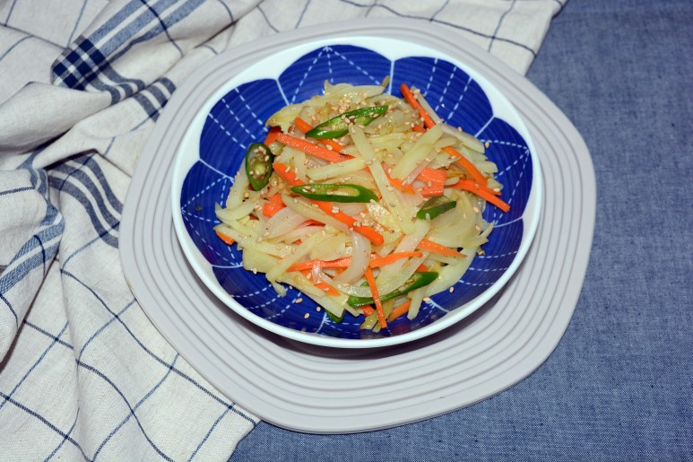 最後に塩ひとつまみで味を調え、全体をよく混ぜ合わせたら、美味しいじゃがいもの細切り炒めの完成です。味見をして、薄ければ塩を少し足してください。